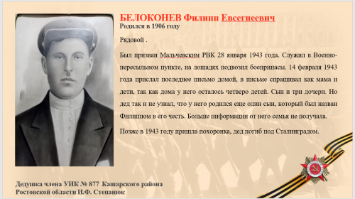 Председатель избирательного участка №877 Ирина Степанюк предоставила информацию о своем дедушке Белоконеве Филиппе Евсегнеевиче, участвовавшем в Великой Отечественной войне.
